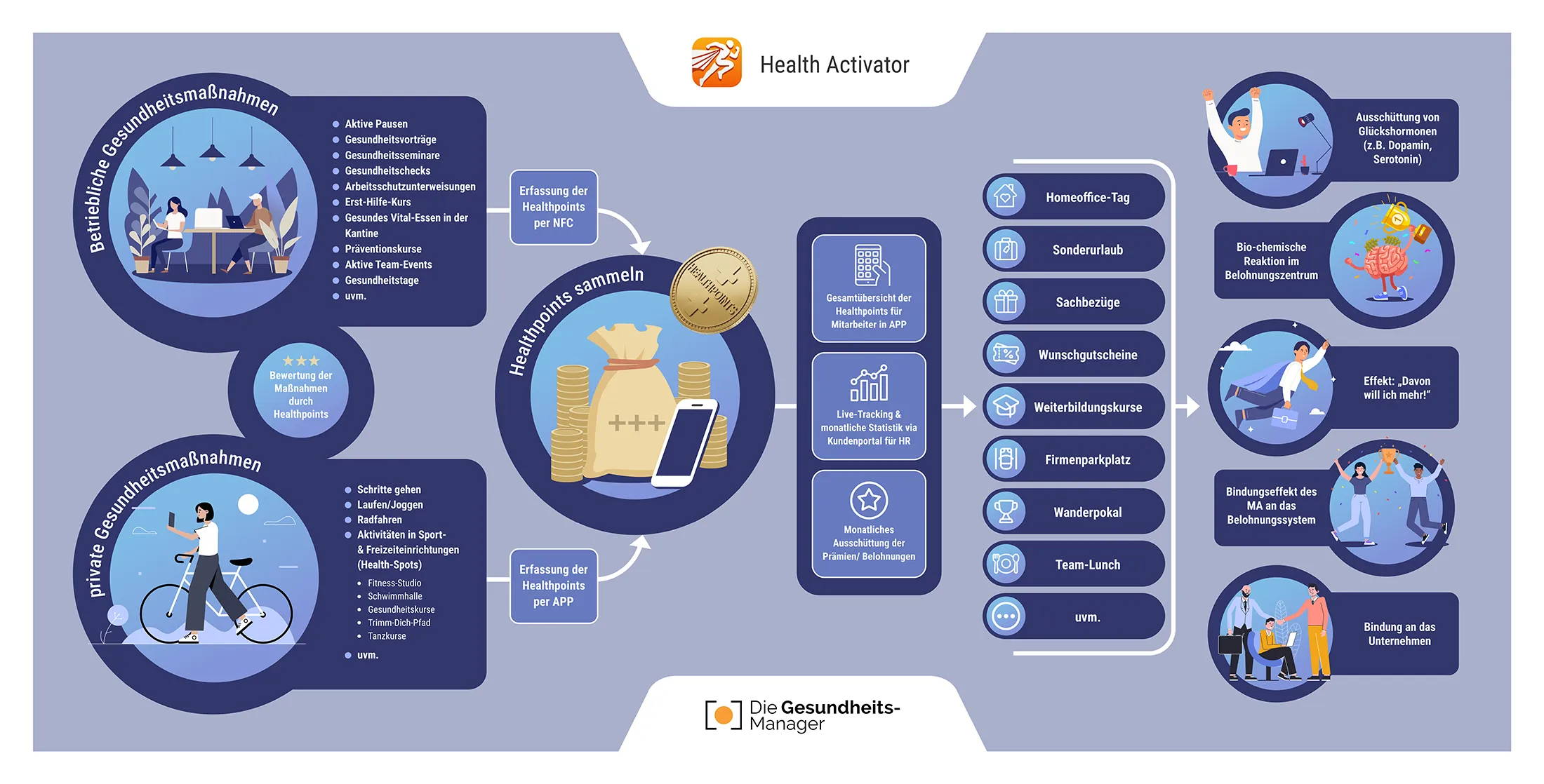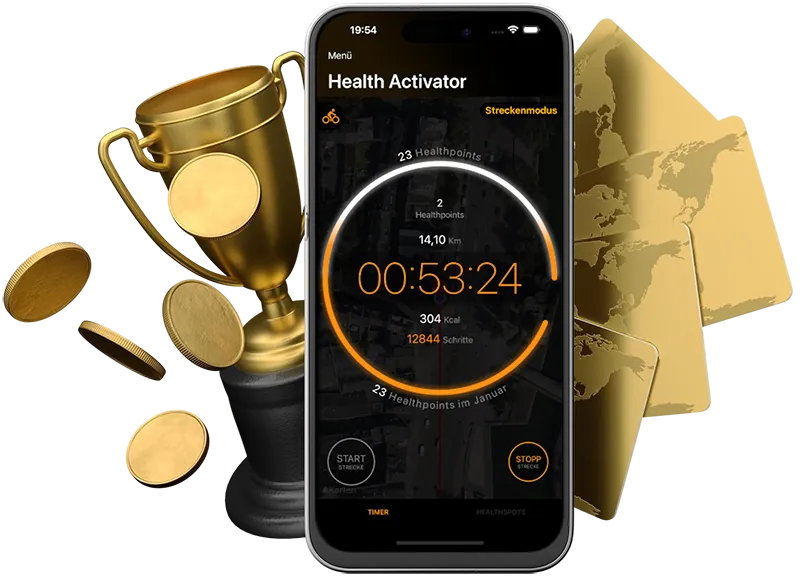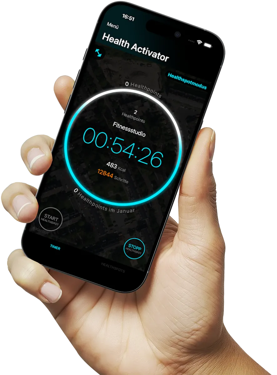 Mit der Plattform können Sie unkompliziert eigene Healthspots erstellen – zum Beispiel Fitnessräume, Outdoor-Trainingsbereiche oder spezielle Kursangebote. Zusätzlich lassen sich Maßnahmen per NFC-Karte verwalten, wodurch die Teilnahme automatisch erfasst und Punkte gutgeschrieben werden. So steuern Sie Ihre Gesundheitsmaßnahmen effizient und individuell.